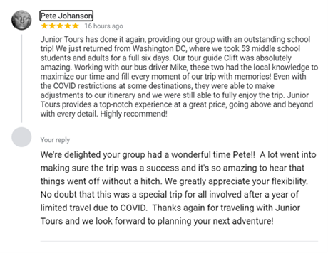 Like many of you, we have missed travel too! Last week was a special moment for us. After nearly a year without group travel, Junior Tours hosted its first school back to Washington D.C….and it was a huge success!